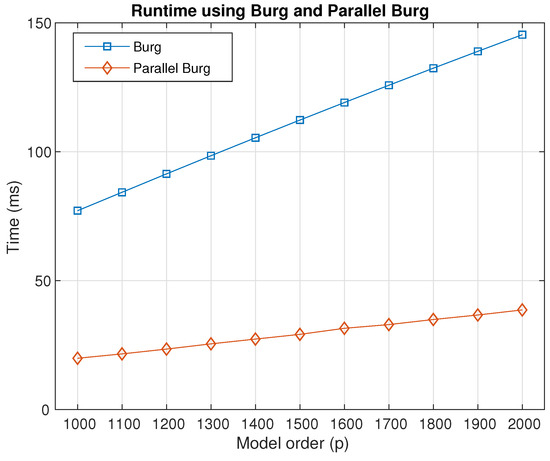 Runtime between the Burg algorithm and the parallel Burg algorithm with model order.