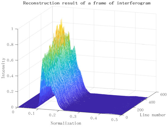 Figure 14 shows the reconstruction of a frame of the interferogram from Figure 7 using the P-Burg method. Before that, we removed the trend item of interferogram and corrected the phase error. The figure is a 3D depiction arranging all the transform results of each column in Figure 7 together. We get the result of a frame within only about 50 ms.