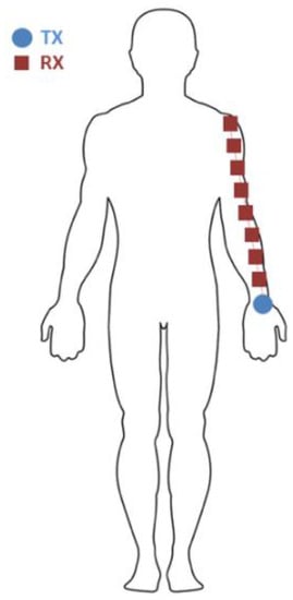 - Anderson, G.S.; Sodini, C.G. Body coupled communication: The channel and implantable sensors. In Proceedings of the 2013 IEEE International Conference on Body Sensor Networks (BSN), Cambridge, MA, USA, 6–9 May 2013; pp. 1–5. [Google Scholar]