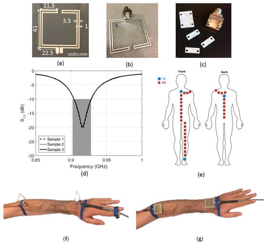 We have used screen-printed, dipole antennas with a free-space power reflection coefficient (S11) below −10 dB at 915 MHz according to the design presented in [37]. Dipole antennas are frequently used in UHF RFID tags [38]. The antennas are printed on a 125 μm-thick polyethylene naphtalate (PEN) substrate (Q65HA from Teijin Dupont Films, Wilmington, DE, USA) [39] using Creative Materials conductive Silver ink no. 12633 [40]. The antennas are fed using a mechanically connected SMA connector (292-64A-06, Centric RF, Allen, TX, USA) which is adapted using a 0.96 ± 0.02 mm thick plastic spacer underneath the center coax in order to eliminate the connector’s capacitance. Figure 2 shows the screen-printed antennas, the connectors with spacer, their dimensions, and their measured S11. The antennas were used to perform on-body path-loss measurements at 915 MHz. Two antennas were placed on the positions shown in Figure 1. A cardboard spacer with thickness 2.83 ± 0.03 mm backed the antennas. The antennas were placed on the body in two configurations: orthogonal to the skin and parallel to the skin, see Figure 2f,g. In the orthogonal case, the connector and a 90° SMA connector introduce 26.8 ± 0.1 mm spacing in between the feed point of the antenna and the cardboard spacer. In the parallel case the connector introduces an additional 4.42 ± 0.11 mm spacing from its bottom until the coax.