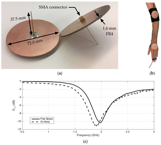 The design of the antenna is presented in Figure 6a: A 37.5 mm monopole sticks out of a 72.0 mm FR4 disk with a double-sided copper ground plane. The antenna is equipped with an SMA connector. For on-body applications, a 90° SMA connector is used, allowing close-to-skin mounting, as depicted in Figure 6b.