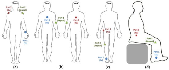 On-body repeater test scenarios: (a) wrist to opposite shoulder, (b) chest to back, (c) ankle to hip in upright pose, and (d) ankle to hip in sitting position.
