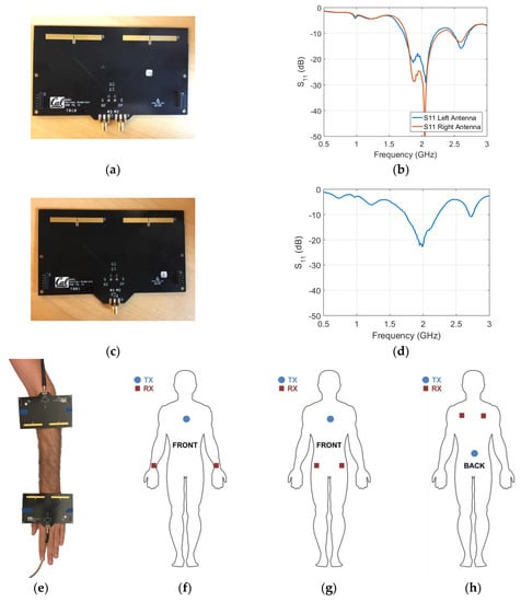 The boards were placed on the subject’s arm in the measurement configuration illustrated in Figure 5b. The boards were placed parallel to the skin, with the antennas facing each other. Once worn on the body, the RX antenna was at a distance of 3.9 mm from the skin, while the transmitter was at a distance of 6.9 mm from the skin.