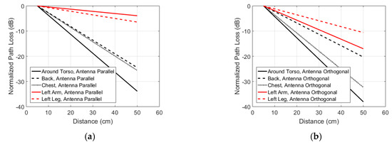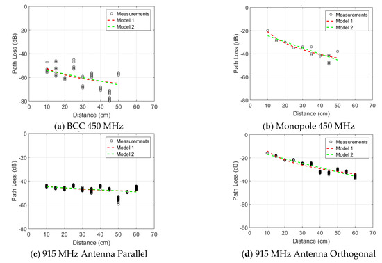 Excluding the measurements at 915 MHz with the antenna parallel to the skin, all path loss curves are clustered along a similar trend. None of the path loss models exceed 35 dB over 40 cm propagation along the arm.