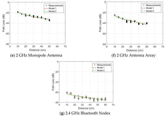 Measured path loss as a function of distance in the reference scenario (left arm). Measurements are shown as black markers, alongside two fits using the two considered path loss models for the seven studied technologies: (a) 450 MHz monopole, (b) 450 MHz BCC, (c) 915 MHz folded dipole parallel to the body, (d) 915 MHz Folded dipole orthogonal to the body, (e) 2 GHz Monopole antennas, (f) 2 GHz Dipole Arrays, and (g) 2.4 GHz Bluetooth nodes.
