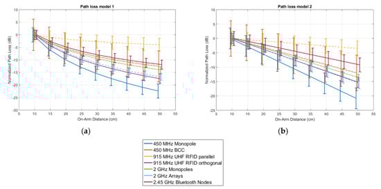 Normalized path loss models as a function of distance in the reference scenario (left arm) for the seven studied configurations: (a) Model according to Equation (1), (b) Model according to Equation (2). The solid lines indicate the models described in Table 2, while the whiskers are standard deviations (whiskers are shifted slightly to increase figure clarity).