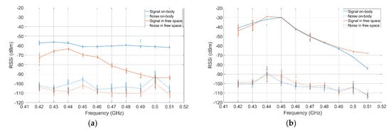 All tests are performed three times under the same conditions for repeatability purposes and then average for plotting. We explored multiple distances between electrodes on a human arm for 10 different frequencies. In order to compare the impact of the human body on the communication channel, free-space measurements (with the same BCC electrodes) were also made. The same subject was standing with both arms along the body (vertically). No other pre-gelled electrode but the two required ones were on the body for each measurement (see Figure 4d,e). The tests with the antennas provided by the manufacturer were performed under the same conditions.