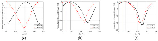 Figure 8f to h shows the three on-body scenarios used for evaluating the effect of beam steering. The phased two-port antenna array was used for the TX node and the power-combined arrays were used for nodes 1 and 2. In all scenarios, the TX node is between 28 and 35 cm away from nodes 1 and 2. As the relative phase between the left and right antenna () is adjusted from 0° to 360°, the TX node’s beam angle is swept through all supported angles. The received power at nodes 1 and 2 for all is shown in Figure 14.