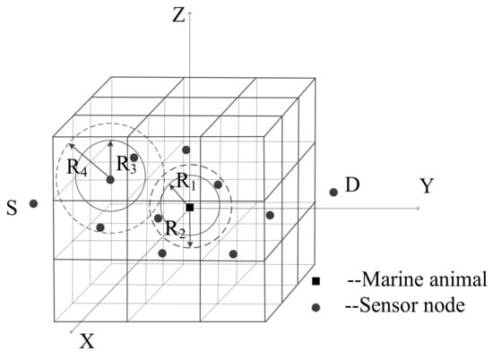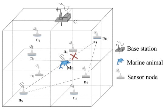 To facilitate the analysis of research objects, the entire network structure is divided into 1000 m × 1000 m × 1000 m sub-volumes. Each sub-volume contains one common sensor node. Sensor nodes are deployed in these sub-volumes according to certain deployment strategies that can increase network connectivity rate and network coverage rate. We use a node non-uniform deployment strategy [] method to deploy the sensor nodes, in which a large number of nodes are mainly deployed in the range centered on the interference area of marine animals, and a small number of nodes are deployed in the path from the interference area to the source node and from the interference area to the destination node. Marine animals such as the Chinese white dolphins are aggregated, so there are a lot of marine animals in a certain area. To simplify the network model, we see many marine animals in a certain area as a whole (one marine animal Ma) to study. And the center of the area where the marine animals are located is the geographical location of the marine animal Ma. The marine animal Ma is always existed in the network and randomly moves around the network. The EOAR protocol derives the location of the marine animal Ma based on the probability that the marine animal will appear in a certain area. Moreover, the marine animal Ma does not move frequently in a certain area, and the range of movement is not large in a short time. Therefore, we can assume that the location of the marine animal Ma is kept in a certain area within a short period of time. It is assumed that the movement of sensor nodes caused by water currents is slow, and the sensor node is relatively stationary for a certain period of time. Sensor nodes in the network are defined as network nodes, and each sensor node can perceive, receive, and forward packets. In addition, it is also assumed that all the sensor nodes have homogenous transmission range and energy consumption. A sensor node is in the sleep state if it is not working.
