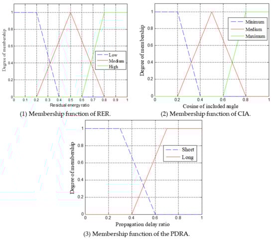 The membership function of the triangle and the trapezoid is used in the fuzzifier to simplify the calculation. For an instance, Figure 5 shows the membership function for the RER, CIA, PDRA, respectively, which uses the triangular and the trapezoidal form. This paper defines 18 fuzzy rules used in fuzzy logic-based forwarding relay selection scheme. Table 2 shows the rules based on inference engine. According to this rule, the three variables of the input are fuzzed to obtain the fuzzy set. Finally, the fuzzy set is defuzzified to obtain a single accurate value. The accurate value of each candidate forwarding relay is expressed as the probability that the node is responsible for forwarding the packets.