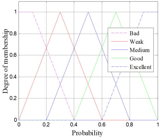 The output of the inference engine, the probability, is classified into five types: excellent, good, medium, bad, and weak. The membership functions of the probability can be seen in Figure 6. Lastly, the result of the above fuzzy operation is determined by using the centroid algorithm. Table 3 shows the examples of the result of the fuzzy operation. For example, if the input variables are ,, , their corresponding membership are medium, medium and short, respectively. Then the fuzzy set is obtained according to the fuzzy logic rules, and the centroid algorithm is used to defuzzify to obtain a single accurate value, in this example, the accurate value is 0.7.
