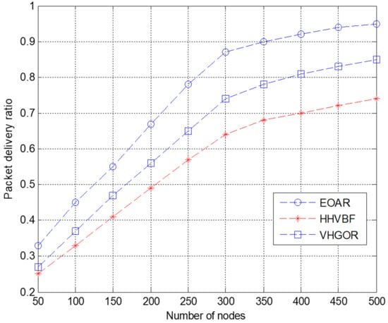 In this simulation, the simulation duration is 500 s and the number of nodes varies between 50 and 500 with a step of 50. As shown in Figure 7, when the number of sensor nodes increases, the packet delivery ratio continues to increase. When the number of sensor nodes is only 50, PDR of the three protocols are relatively low. Since the number of sensor nodes is very small, it is impossible to form an optimal route. This may lead to packet loss during transmission, resulting in a low packet delivery ratio. Till the number of sensor nodes increases to 300, the packet delivery ratio continues to increase as the number of sensor nodes increases. This is because as the number of nodes increases, the number of neighbor nodes in the candidate forwarding relay set increases and the success ratio of transmitting the data packet from the current node to the destination node becomes higher. Therefore, adding sensor nodes will have a greater impact on network routing reachability. When the number of nodes is 300, the PDR of HHVBF and VHGOR protocols has increased by 35.9% and 17.6%, respectively. However, when the number of nodes reaches a certain value, PDR grows slower and is closer to the ideal value of 1. In this simulation, 300 can be seen as a turning point of the parameter—the number of nodes. When the number of nodes is 500, the PDR of HHVBF and VHGOR protocols has increased by 28.4% and 11.8%, respectively. Compared with HHVBF and VHGOR, EOAR always has the highest PDR with the same number of nodes. Therefore, it is observed from the evaluation that our proposed EOAR protocol can improve the packet delivery ratio compared with the other two protocols.