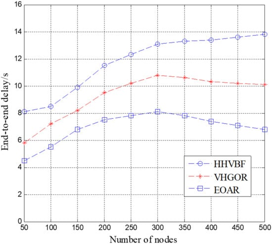 As shown in Figure 8, the end-to-end delays of the three different underwater acoustic network routing protocols are constantly changing. Compared to the HHVBF and VHGOR protocols, EOAR significantly reduces end-to-end delay. Till the number of nodes is up to 300, the end-to-end delay of the three protocols increases as the number of nodes increases. After that, the end-to-end delay of EOAR is significantly smaller than the other two protocols. The end-to-end delay of EOAR is 38.2%, 25.0% lower than that of HHVBF and VHGOR when the number of nodes is 300, respectively. This is because in spare network, there are a smaller number of potential forwarding relays. On the other hand, in a dense network, a node can find more potential forwarding relays, which takes more calculation time and waiting time than in a spare network. Moreover, under the interference of marine animals, the HHVBF protocol completes the routing that can avoid interference from marine animals is by forming a pipe for neighbor nodes of each hop and forwarding packets to all nodes in this pipe until the destination node receives the data. Therefore, the waiting time and transmission time of HHVBF are constantly increasing as the number of nodes participating in the forwarding increases. EOAR and VHGOR selects the nodes in the candidate forwarding relay set considering the interference area, which may reduce the number of nodes in the candidate forwarding relay set. EOAR and VHGOR can save the calculation time, waiting time and transmission time. Therefore, in the experiment, EOAR and VHGOR have less propagation delay than HHVBF. In addition, VHGOR does not use the method of priority-based forwarding, so when the best relay does not successfully receive the packet, retransmission occurs, causing the propagation delay to increase. This shows that the advantages of the EOAR are obvious: EOAR performs efficient routing performance when sensor nodes are densely deployed and there are marine animals in the network.