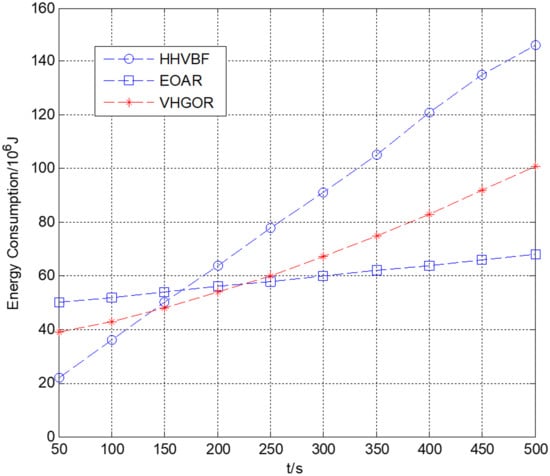 In this simulation, the number of sensor nodes is 300. The initial energy of each node is 109 J. The power consumption for transmitting state is 10W and the power consumption for the idle state is 30 mW. It can be seen from Figure 9 that the relationship between energy consumption and time in three different routing protocols. As time increases, node energy consumption increases gradually. In the beginning, the EOAR energy consumption is higher than the VHGOR and HHVBF protocols. For example, when the simulation time is 50 s, the energy consumption of EOAR is 3.5 × 107 J, and it is higher than the other two protocols. This is because the current node needs to adopt the acoustic perceive method to calculate the interference area of animal-nodes in the EOAR protocol when it encounters the interference of the marine animals. However, after a period of communication, the total energy consumption of the EOAR protocol is lower than the other two protocols because EOAR is able to avoid packet collisions and reduce the number of nodes participating in forwarding. In the simulation time of 500 s, the total energy consumption of EOAR is lower than the total energy consumption of the other two protocols. Compared with HHVBF and VHGOR protocols, the energy consumption of EOAR is reduced by 53.4% and 32.7%, respectively. This proves that the EOAR protocol has obvious advantages in reducing communication energy consumption in long time operation.