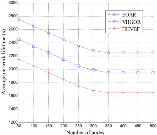 The average network lifetime was measured for the EOAR protocol and compared to the HHVBF and VHGOR protocols, as shown in Figure 10. It can be clearly seen from the figure that the network lifetime of EOAR and VHGOR are longer than that of the HHVBF protocol. This is because the HHVBF protocol only depends on the depth information of the candidate forwarding relays to select the best forwarding relay that forwards the packet, whereas the EOAR and VHGOR protocols consider the residual energy of the candidate forwarding relay in selecting the best forwarding relay. In addition, the EOAR protocol can also reduce packet collisions by setting the waiting time, so EOAR has a higher network life time than VHGOR.