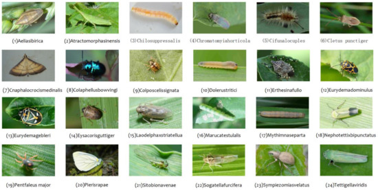 The dataset used in Xie’s work [7] was adopted in this work, which contains 24 common images of insects in crop fields, such as Aelia sibirica, Atracto morphasinensis, Chilo suppressalis, etc. Figure 1 shows the scientific names and sample images of 24 insect species. To improve the generalization ability of this model, more images collected from the Internet were used with a data augmentation technique.