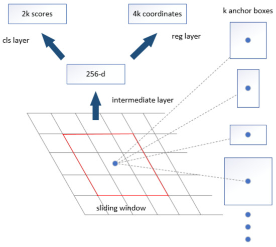 Region Proposal Network [25,26] takes an image of arbitrary size as input, and outputs a set of rectangle proposal boxes, where each box has an object score. To generate regional proposals, a small network, which takes an n × n spatial window of a convolutional feature map as input, was moved on the convolutional map of the last shared convolutional output. A 3 × 3 sliding window was selected for convolution mapping and generated a 512-dimensional feature vector. Figure 3 shows the architecture of the Region Proposal Network used in this work. At the location of each sliding window, multiple regional proposals were generated on the current sliding window and corresponded to various scales and aspect ratios. Here three scales and three aspect ratios were used, which resulted in k = 9 regional proposals for each slide location. The proposals are also called anchors. The regional proposals were then input into two full-connected layers—the bounding box regression layer (reg) and the bounding box classification layer (cls).
