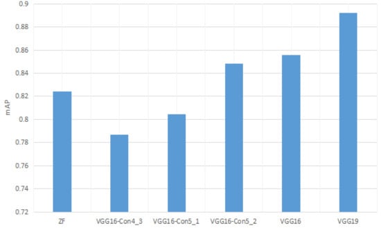 To evaluate the effect of feature extraction on the performance of this model, several feature extraction networks were implemented on the dataset “MPest”, which contains VGG16 with different convolutional features. Generally, the greater number of convolutional layers the model has, the more complex features the model can learn from the images. All of the comparison methods performed 160,000 iterations, with the initialized learning rate of 0.001. Figure 5 shows the performance comparison of the three methods on this dataset. It can be seen that the VGG16 network achieved good performance, but the proposed network achieved an improvement of 3.72% over VGG16. Regarding the ZF network, it consists of a simple architecture of only five convolutional layers and 7 × 7 filters, which results in quick feature map shrink and, thus, cannot extract effectively the multi-faceted features of insects from images. Both VGG16 and VGG19 belong to deep neural networks, where the former contains sixteen convolutional layers and the latter contains nineteen layers. The model with high-level convolution layers can effectively enhance the ability of the proposed model to extract information on insect characteristics under complex backgrounds. Moreover, a 3 × 3 filter was implemented in VGG because multiple 3 × 3 small filters have more nonlinearity than a 7 × 7 large filter, which makes the decision function more decisive.
