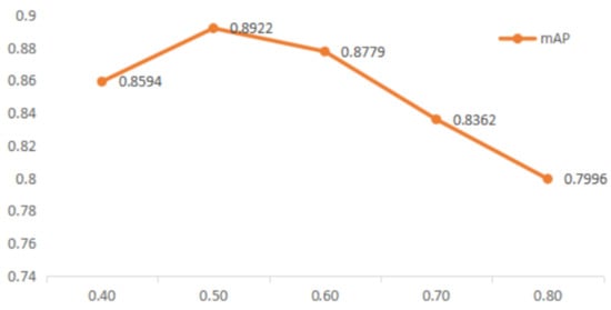 That is to say, the increase of the threshold results in abandoning more predicted regions which overlap less with the ground truth. The mAP curve reaches maximum value when the threshold is set to 0.5, where 89.22% of the ground truth are detected successfully. Starting from 0.6 to 0.8, the curve declines slowly. The larger the value of IoU is, the more predicted regions the model abandoned in the regional proposal stage. Therefore, the lower threshold results in an excessively small overlap area between the predicted region and ground truth, where more backgrounds were present in the classification task. Higher thresholds lead to larger discarded prediction regions, which results in an unsuccessful training model.