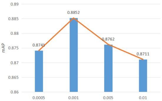 Looking at Figure 8, it can be seen that, as the learning rate increases, the error of the model gradually decreases. Moreover, a small learning rate leads to a slow update speed of weights of the model and, subsequently, the convergence of the model is not ideal. Therefore, as the learning rate increases, the experimental error of the model gradually decreases. When the learning rate exceeds 0.001, the mAP of the proposed model begins to decrease. A higher learning rate means that the convergence speed of the model is too fast, which results in a larger loss value than expected in the iterative process and makes the model over-fitting.