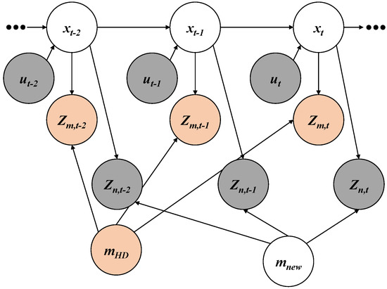 As shown in Figure 3, the nodes of the HD map and the map-matching feature measurements are added to the graph representation. In a similar manner to the new feature layer and the new feature measurements, the HD map and map-matching feature measurements can be parameterized into different forms such as landmarks, occupancy grids, and point clouds.