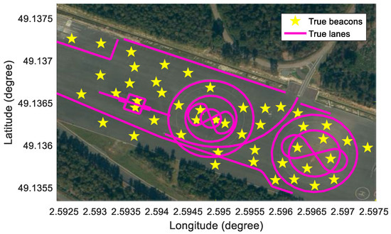 In order to perform the simulation, a test vehicle is equipped with a high-precision Global Navigation Satellite System/Inertial Measurement Unit (GNSS/IMU) with m positioning errors, in-vehicle motion sensors, and a low-cost GNSS with m positioning errors. To estimate new features, the mapping data consists of vehicle motion data (yaw rate and speed), a low-cost GNSS, and virtual noised lanes and beacons. The virtual lanes and beacons replace the actual features for the purpose of analyzing the effects of the sensor noises. The test site is UTAC CREAM in France, as shown in Figure 4.