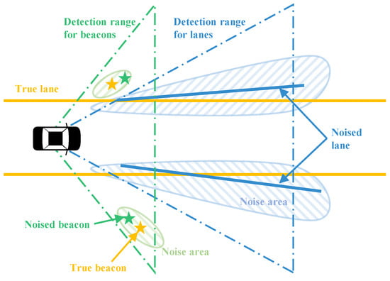 The GNSS/IMU can measure the precise pose of a vehicle. The precise pose can be used to simulate the information which would otherwise be gathered by low-cost perception sensor information. First, a true beacon layer and a true lane layer need to be pre-defined in the WGS84 coordinates, as shown in Figure 4. The true beacon layer plays two roles in the simulation: (1) the source information to generate noised beacon measurements, and (2) the ground truth information to evaluate the beacons estimated by the proposed algorithm. On the other hand, the true lane layer also plays two roles in the simulation: (1) the source information to generate noised lane measurements, and (2) the existing feature layer in the HD map for matching with noised lane measurements. Second, when the test car is driven in the test site, the global positions of the beacons and the lanes within the detection range of the car can be inferred from the two true layers based on the precise GNSS information, as represented in Figure 5. Next, the beacons and the lanes in the WGS84 coordinates are converted in the vehicle coordinate so as to simulate the perception information. Finally, Gaussian white noises are added to the computed precise perception information to simulate the noised beacons and the noised lanes which can be measured by low-cost sensors. The perception sensor noises added to the sensor measurements are designed as functions of the noise level and in Table 1. Basically, the two noise level parameters are initialized as 1.