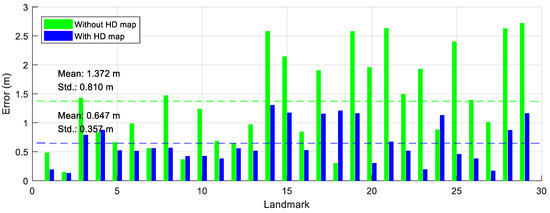 The distance errors of the beacons are shown in Figure 6. The green bars in Figure 6 are the errors of the beacons generated by the new feature mapping algorithm without the HD map. The mean and the standard deviation of the errors without the HD map are m and m, respectively. The blue bars in Figure 6 represent the errors of the beacons generated by the new feature mapping algorithm with the HD map. The mean and the standard deviation of the errors with the HD map are m and m, respectively. The mean and the standard deviation of beacons considering the HD map are smaller than those of the beacons not considering the HD map, because matching information with the HD map is used to estimate the positions of the beacons. In other words, the beacons can be more precisely estimated when considering the HD map.