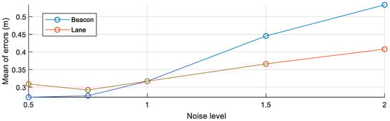 While the noise level l of a sensor is changed from to 2, the noise level l of the other sensor is fixed to 1 for analyzing the effect of the noise of the target sensor. After the noise level of the target sensor is selected, beacons are estimated using the HD map-based new feature mapping algorithm and the RLS algorithm using crowd-sourced data. The beacons are evaluated by the true beacon map. The means of the errors of all beacons are shown in Figure 8. The blue line represents the change of the mean of the errors along the change of at , while the orange line represents the change of the mean of the errors along the change of at . When the noise level of the lane sensor increases, the means of errors of the beacons increase. Since the noised lanes have different shapes with the HD map, the rotation and translation matrices computed by the GICP algorithm are more incorrectly estimated along the more noised lanes. The most significant effect on the result is the noise of the beacon sensor. When the noise of the beacon sensor increases, the estimated beacons become inaccurate, because the noised information is directly combined with the estimated positions of the beacons.