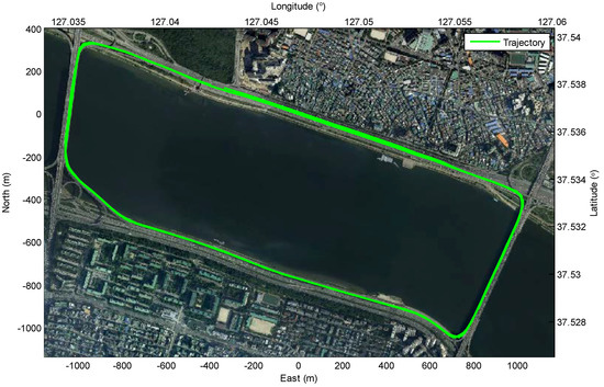 In order to evaluate the algorithm in two ways such as mapping and localization, the test vehicle is equipped with a commercial camera (Mobileye EyeQ3), a LIDAR with 16 layers (Velodyne VLP-16), a high-precision GNSS/IMU (OXTS RT3002), a low-cost GNSS(U-blox EVK-6T), and in-vehicle motion sensors (a yaw rate sensor and a wheel speed sensor). The camera can detect the lane information at 15 FPS in the 40° horizontal view. The LIDAR with 16 layers can detect the point clouds reflected from the surrounding environment at 10 FPS in the 360° horizontal view. Although either the image processing approach [27] or deep learning approach [28] can be applied to detect the streetlights, the pole-like object detector based on the multi-layer LIDAR [29] is applied for convenience in the experiments. The high-precision GNSS/IMU and the low-cost GNSS have m and m position accuracy, respectively.