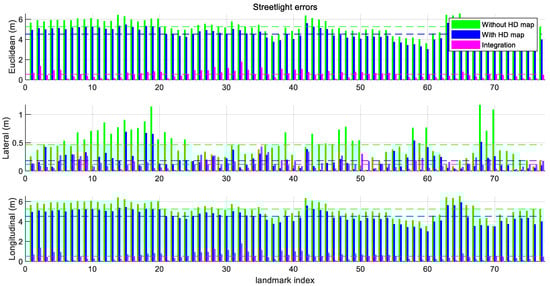 The green bars in Figure 10 are generated by the new feature layer mapping without the HD map in a single intelligent vehicle. The blue bars in Figure 10 show the errors of the streetlights estimated by the HD map-based new feature layer mapping in the single driving. The magenta bars are made by the map integration using crowd-sourced new feature layers. The means and the standard deviations of the errors from several conditions are shown in Table 2.