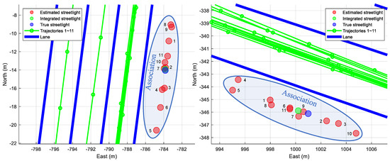 To evaluate the results of both the individual new feature layer estimated by one mapping data and the integrated new feature layer estimated by multiple mapping data, the Euclidean distance errors of the estimated streetlights are shown in Figure 10. In contrast, only considering the Euclidean distance errors for the evaluation in the simulation, the graphs in Figure 10 include Euclidean distance errors, lateral distance errors, and longitudinal distance errors. The lateral errors and longitudinal errors between the ground truths of the streetlights and the estimated streetlights refer to the differences in the perpendicular direction and the parallel direction of the trajectory of the vehicle, respectively. The reason for using three types of errors is to reflect the properties of lanes as follows. As shown in Figure 11, the lanes in the HD map cannot determine the longitudinal position of the vehicle because lanes are continuously represented as similar lanes which are placed straight toward the longitudinal direction in the motorway condition. While the lateral position of the car can be estimated by matching information of these lanes, the longitudinal position cannot be estimated precisely in the same way. Therefore, when the lane matching is considered, the streetlights are more precise to the lateral direction than they are to the longitudinal direction. On the other hand, the longitudinal errors of new features estimated with the HD map are caused by noises of sensors such as wheel speed sensors and low-cost GNSS. Since each new feature estimated by each driving is spread to the longitudinal direction around the ground truth of the streetlight as shown in Figure 9, the new feature integrated by the RLS algorithm approximates the ground truth of the streetlight.