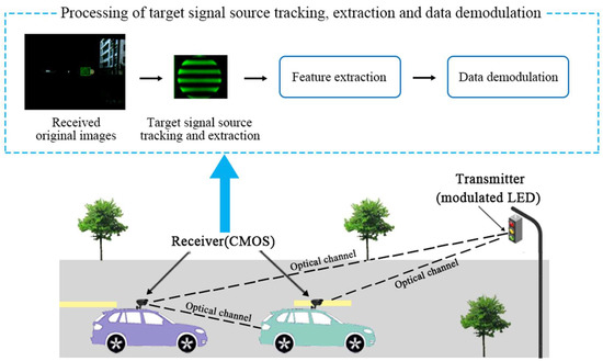 To our knowledge, studies on image-sensor-based OVLC, where LEDs are used as a transmitter and a high-speed camera is used as the receiver, such as intelligent transport systems, are mainly aiming at increasing transmission speed, reducing the BER (bit error rate), or solving other normal communication problems. In most of the existing image-sensor-based VLC studies, the transmitter (signal source) or the receiver (camera) is fixed, or the background of received images is already clean and information can be demodulated directly from these images, such as in References [15,16,17], where only signal source LEDs are left in images after adjusting the exposure time of the camera. In addition, in the field of visible light positioning (VLP) based on VLC, which is most closely related to tracking algorithm research, few studies take accuracy, robustness, and real-time ability into consideration simultaneously. In Reference [18], a MiniMax filter is used to estimate the trajectory of the terminal (receiver), which can only support low speed motion (poor real-time ability) and is merely theoretically simulated. In Reference [19], a positioning accuracy of 7.5 cm is provided while robustness (such as motion blur, background interference) is ignored. Reference [20] proposed a probability-based algorithm to track the signal source LED under a motion blur situation, whose method is similar to our previous work [4]. While, in Reference [20], only simulation experiments were carried out and there no practical experimental results are given, making it only theoretically feasible. All these works have not taken background interference into consideration, which is the main obstacle in the applications of OVLC system. However, it is worth mentioning that image-sensor-based VLC is unlike other communication techniques, which means that there will be different interferences (luminous or reflective objects) that are left in the images though adjusting exposure time, especially in an outdoor dynamic scenario. In other words, the premise of realizing communication in an image-sensor-based VLC system with different background interferences is to track the target signal source LED and extract the target area accurately and completely from received images, while it is usually ignored in the exiting studies to our knowledge. Moreover, given the various attractive advantages of complementary metal-oxide-semiconductor (CMOS) sensors [21], a CMOS sensor is used as the receiver in this paper.