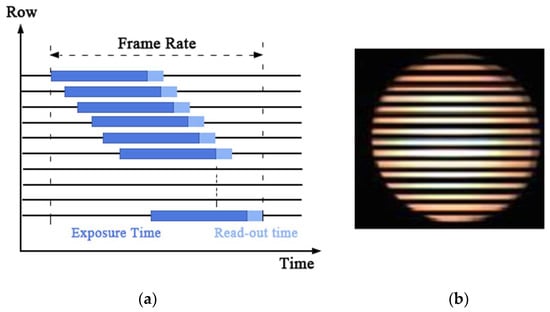 (a) The rolling shutter mechanism of the CMOS. (b) The target signal source LED area of the captured image of the CMOS sensor after a period of exposure.