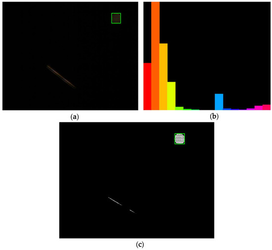 (a) Original image, (b) histogram of the H component of the target LED signal source, and (c) back-projection image, respectively.