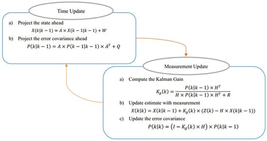 A Kalman filter algorithm has two major parts: predict and update. It predicts the target’s current state based on the previous state of the target and obtains the predicted value of the target’s current state. Furthermore, the Kalman filter is updated with the measured value of the target of the current state. The process of predicting and updating is shown in Figure 5.