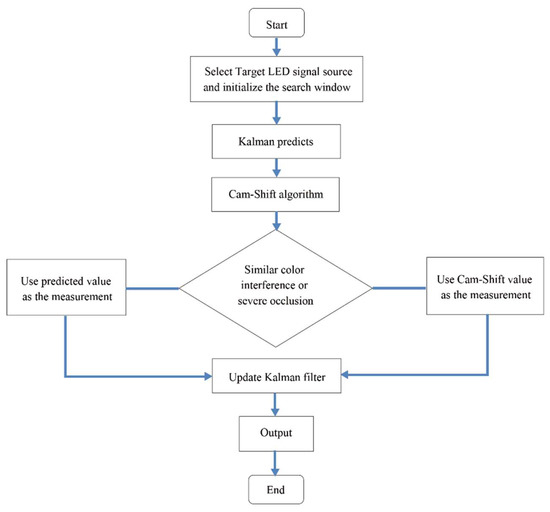 A detailed procession of the proposed tracking algorithm is shown in Figure 6. First, select the target LED source signal area as the tracking target and initialize the search window. Then, use the Kalman filter algorithm and Cam-Shift algorithm separately. When there is no similar color interference or severe occlusion, the central position of the search window is used as the measurement to update the Kalman filter; otherwise, the predicted value calculated by the Kalman filter is used as the measurement. This paper uses and to determine whether the tracking is interfered by similar color or severe occlusion, respectively. The calculation formulas of and are as follows: