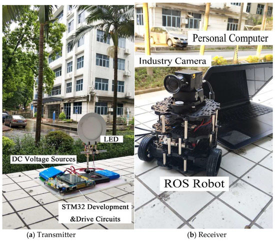 The experimental system is shown in Figure 7, including two parts: the transmitter and the receiver. The transmitter contains direct current (DC) voltage sources, an LED, an STM32 (STMicroelectronics32) development board, and a drive circuit board. The receiver contains an industry camera, a ROS (Robot Operating System) robot, and a computer (Dell Inspiron 5557, Windows 10, 4G RAM, Intel (R) Core (TM) i5-6200U CPU @ 2.4GHz). DC voltage sources supply power to the LED and circuit boards. The LED emits a modulated optical signal to the receiver. The STM32 development board generates modulation information and the drive circuit board drives the whole transmitter circuit system. The industry camera is installed on the ROS robot, receiving modulated information from the transmitter and the ROS robot simulates the movement of a vehicle. The computer processes the received images from the industry camera with the proposed tracking algorithm to track the LED signal source in real time. The open source computer vision library (OpenCV, which was founded by Intel in 1999 and is now supported by Willow Garage. And version OpenCV 3.4.0 is used in this paper which was released on December 23, 2017) is used to complete processing process with C++ language. Specifications of the industry camera, LED, ROS robot, STM32 development board, and the drive circuit board are shown in Table 1.