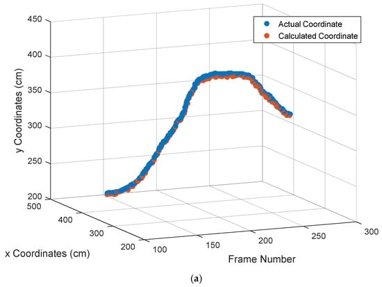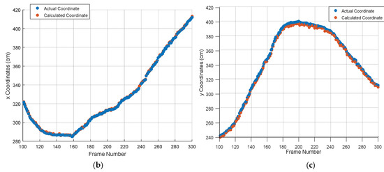 The calculated coordinate value and the actual coordinate value of the target signal source LED: (a) tracking result of the target signal source LED, (b) Tracking result of the x coordinate, and (c) tracking result of the y coordinate.