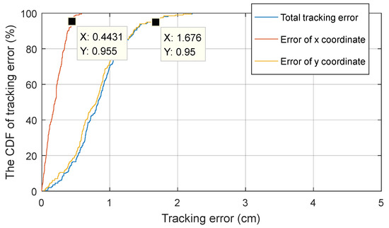 The CDF is a frequently-used index for error analysis, such as in References [4,5,22]. When evaluating the tracking or positioning accuracy, the abscissa represents the error and ordinate represents the probability. Furthermore, when the ordinate value is fixed, the smaller the abscissa, along with the error value, the more accurate the algorithm performs. Usually, the ordinate value is 90% or 95% as a judging standard.