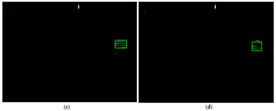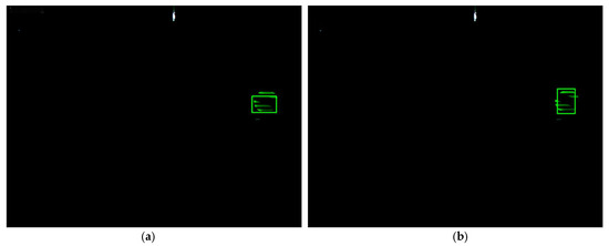 Furthermore, similar target interference and background interference occurred. A light green round LED, whose shape is the same as the target signal source LED and color is similar, entered the field of view of the industry camera. Furthermore, the background of the outdoor part appeared in the images due to reflecting sunlight, which has strong luminance and cannot be eliminated by adjusting the exposure of the industry camera. When the target signal source LED approaches the LED with similar color and severe background interference occurs, the traditional Cam-Shift algorithm would mistakenly consider the interfering LED or the background as the target and expand its search window, causing a tracking failure. The proposed algorithm can adjust its search window, shrink it, and use the Kalman filter predicted value as the measurement to update the Kalman filter when a similar color interference occurs until the target signal source LED leaves the similar background area. As can be seen from Figure 13, the extracted region contained the whole target, in other words, the proposed algorithm tracks accurately and has good robustness when interference occurred, extracting the target signal source LED area accurately, and laying foundations for communicating.