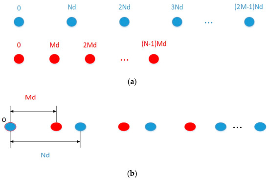 (a) Two uniform linear array (ULA) sub-arrays with sensors number and , respectively; (b) the co-prime linear array (CPLA) consists of the two ULAs shown in (a), with and being co-prime integers.