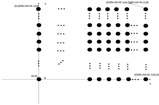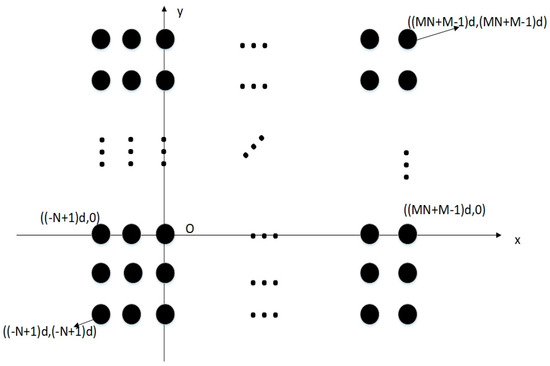 where and imply that the column of and have the dimensionality of , respectively. Equation (21) indicates that can be considered as the autocorrelation matrix of the received signal vector. is the source in noiseless conditions. is a Hermitan and Toeplitz matrix and are both Vandermonde matrices. After matrix reconstruction using the Khatri–Rao product, our equivalent received signal can be transferred into another virtual array received signal. The distinct elements in indicate that the uncorrelated signals as defined before are incident signals on the plane array whose locations could be displaced in the set . This newly constructed array exhibits the geometry depicted in Figure 4.
