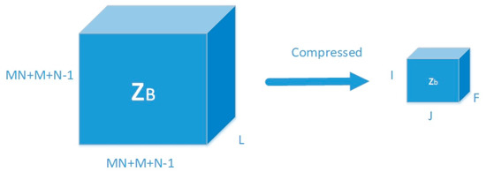 We use Equation (23) as the conventional trilinear model and three compressed matrices— with and —whose elements are drawn randomly from the continuous distributed area in , respectively [29]. Then we can obtain the three compressed matrices as follows: