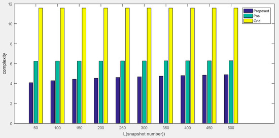 The computational complexity of our proposed method is , which is mainly caused by the covariance matrix calculation, Khatri–Rao product, and compressed trilinear decomposition. By contrast, the method in Ref. [25] has a complexity of , where denotes the number of the spectral points of the total field-of-view. Due to the method of calculating two auto-correlation matrices from the decomposed two subarrays and searching for peaks in partial fields, a large computational load still exists. The method in Ref. [27] involves the step of 2D grid searching to realize the DOA estimation, which requires a complexity of . Therefore, our proposed method shows a superior performance in terms of computational complexity, as it does not require peak searching, or a predefined grid sampling. For the sake of clarity, the computational complexity comparison of our proposed method with other similar approaches is listed in Table 1. For spectral and grid searching with a step of 0.05°, we also compare the complexity of methods versus snapshots and number of elements in Figure 6 and Figure 7, respectively.