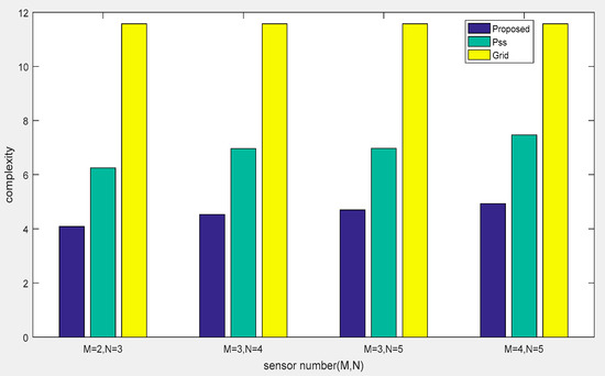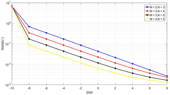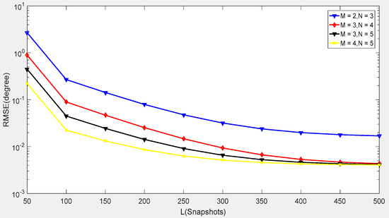 It can be concluded from Figure 10 and Figure 11 that the RMSE performance of the proposed algorithm decreases with the increase of the number of sensors in the CPPA. This is due to a larger array aperture, which can be obtained for the CPPA when more sensors are available. Moreover, no matter how many sensors were utilized, the RMSE performance continued to decrease when the SNR or snapshot number increased. This phenomenon indicates the effectiveness of our proposed method for different CPPA configurations. When we consider real applications, such as the measurement of the radar signal parameters, we only need a small sensor number to construct the co-prime planar array under a large snapshot number condition. Figure 11 shows that the array figuration of M = 2, N = 3 can achieve a similar angle estimation accuracy to the figuration of M = 4, N = 5 when the snapshot number is 500. This result means that we can utilize limited sensors to obtain high accuracy, which is also beneficial for minimizing array arrangement costs.