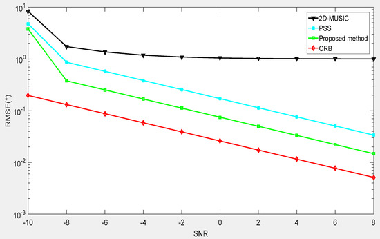 The first example is an estimation of the performance of our proposed method in terms of the signal-to-noise-ratio (SNR) and a compare of our proposed method with several DOA algorithms exploited in the CPPA, such as 2D-MUSIC and partial spectral search (PSS), which are directly performed on the array. Meanwhile, the Cramér-Rao bound (CRB) derived from Ref. [31] for the CPPA is also employed as a benchmark to estimate the performance. Figure 8 depicts the RMSEs of different methods under the simulation conditions of Monte-Carlo trials and an SNR in the range of −10 dB to 10 dB. The incident sources were located at . As shown in Figure 8, we found that the performance was improved with the increase of the SNR. Our proposed method outperformed the other methods, exhibiting a lower complexity. Moreover, when the SNR was higher, our proposed method obtained a result closer to the CRB.