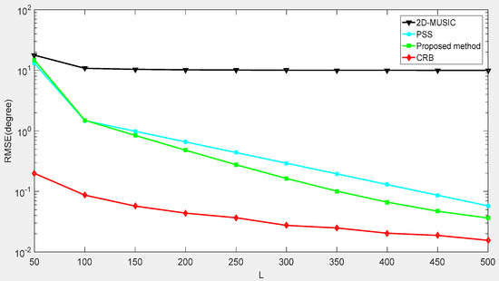 The second experiment was to test the estimation performance of our proposed method versus snapshot numbers. We assumed that the SNR = 0 dB and the snapshot number varied from 50 to 500. The signals were located at . Figure 9 shows that under the condition of a small SNR and a low snapshot number, our proposed method still had a better performance than other methods and approached the CRB, owing to the aperture extension and the use of trilinear decomposition.
