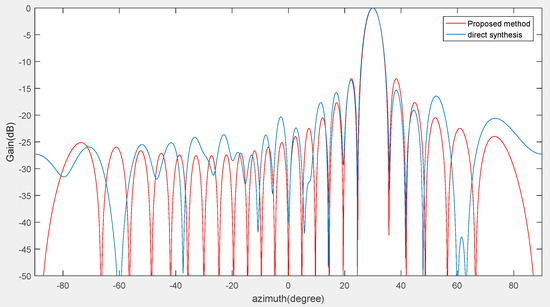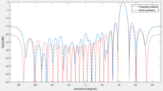 Through the above three experiments, we validated the effectiveness of our method used in co-prime planar arrays and compared it with similar state-of-the-art approaches from the perspective of accuracy and sensor numbers. It is known that high accuracy and low figuration sensor array cost are very important in complex electromagnetic environments where multiple effective signals are submerged by various types of noises and interferences. Even in low SNR environments (such as SNR = −15 dB), the proposed method can still detect the target signals and reduce the side lobes of the beam patterns. Figure 12 and Figure 13 show the results of the angle estimation at the desired angle (azimuth = 30°, elevation = 45°). As shown in Figure 12 and Figure 13, the side lobes are lower than the direct synthesis beam patterns and the main lobe is nearly identical to them.