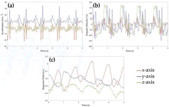 Example of signals acquired by (a) accelerometer, (b) gyroscope and (c) magnetometer during 5 s of walking of a healthy subject.